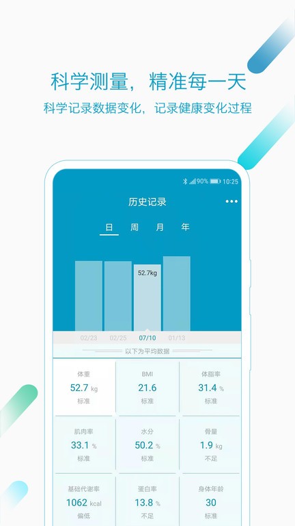 利用BIA生物电阻技术,以体重以及身体固定数据(年龄、身高)借助科学公式计算,计算出BMI、体脂率、肌肉率、水分、骨重、基础代谢率、蛋白率等18项身体数据,帮助你管理身体。