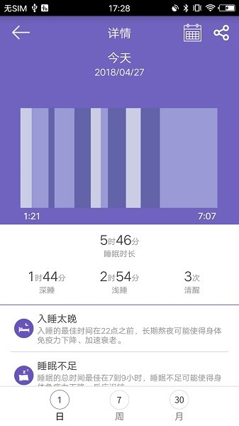 记录每天的睡眠情况,告知您每天的深睡、浅睡和清醒数据。