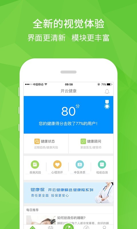 “健康管理、慢病干预、家人关怀、专业指导”是开云健康的主要功能。开云健康通过蓝牙连接血压计、血糖仪、体脂仪等健康检测设备,采集数据进行分析,提供运动、饮食、心理等方面的指导,协助养成健康生活习惯。 在微信上就能看到家人的健康数据,并提供专家热线进行健康咨询和指导。