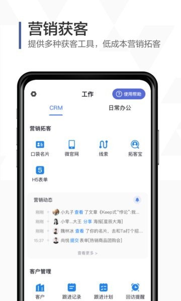 - 营销拓客:满足企业多渠道获客、线索统一管理,同时提供丰富的获客素材、获客手段触达客户,强化社交获客能力,推动客户转化