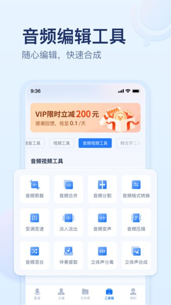 内置完整的音频编辑模块,支持音频修改、音量调节、音频裁剪、音频变声、拼接、提取和变速等操作。