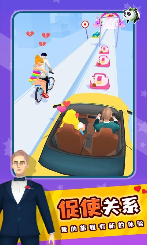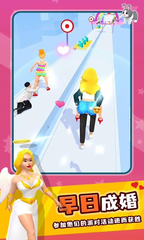 令人感到解压的体验,通过灵敏的操控自身的角色,尽情的奔跑,同时赛道上会有各种道具,搜集起来,能够协助你更顺利的通关哦,同时享受乐趣,享受恋爱关系中的点点滴滴。就像爱的马拉松,终点就是你的成婚当天!