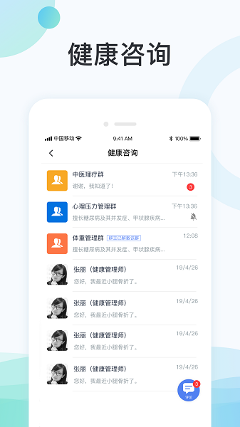 线上通过健康管理群,实现与健康管家的及时沟通、在线交流。有问题找健康管家,共同迈向健康新时代。