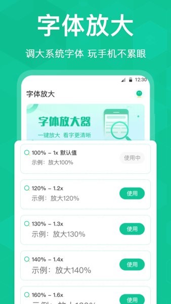 可以放大手机系统字体的软件。软件专为老年用户打造,能够有效的解决老年人开不清手机界面的困扰,随心所欲的放大字体,让用户能够清楚的看到手机中的内容,非常好用。