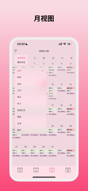 这个视图通常以一个月为时间单位,通过日历形式展示每天的日程安排和任务。月视图有助于用户进行更长远的规划和安排,比如安排假期、项目里程碑或重要会议等。用户可以在这个视图中快速查看和调整整个月的计划。