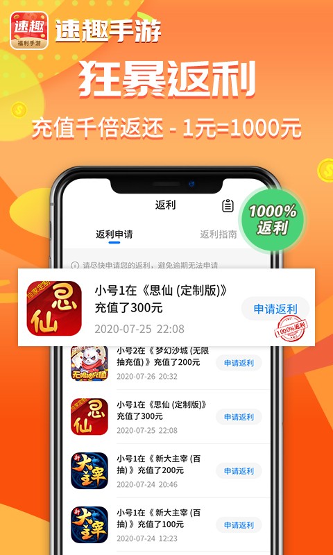 速趣手游盒子是主要提供变态游戏的福利手游盒子,不仅游戏资源丰富齐全,类型多样,还提供丰厚的福利优惠活动,支持充值返利,拥有高爆率,提供独家专属礼包相送,助你快速通关,领取更多的奖励,嗨到停不下来,可谓是好玩又有趣!