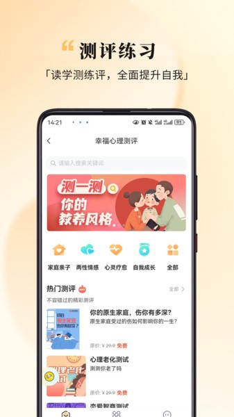 心理测评:围绕家庭亲子、两性情感、心灵疗愈、自我成长等分类进行全方位测评。