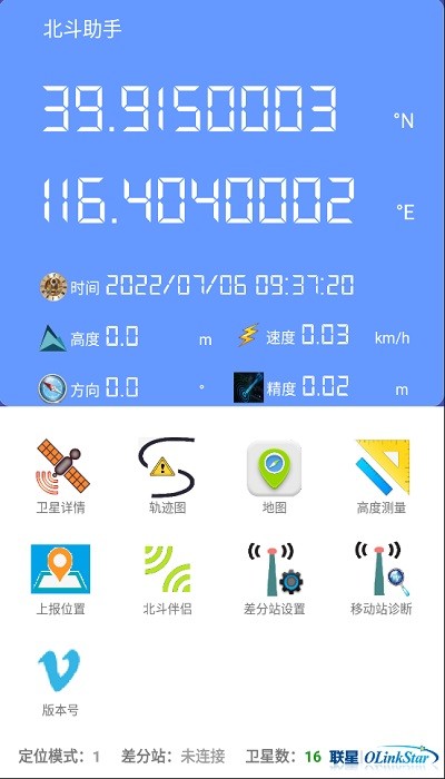 在7273下载打开软件,可以看到北斗伴侣、卫星详情、轨迹图、地图、差分站设置、移动站诊断、版本号等内容,以及所在地的经纬度、高度、速度、方向、精度、时间、日期等信息;