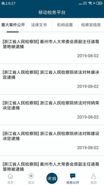 浙江检察App为全省律师提供案件程序性信息实时短信推送、在线阅卷、检察官约见、羁押必要性审查等功能。为全省人大代表和政协委员提供提案监督办理功能。为全省人民群众提供控告、申诉、举报功能,件件有回复,增强人民群众获得感幸福感安全感。