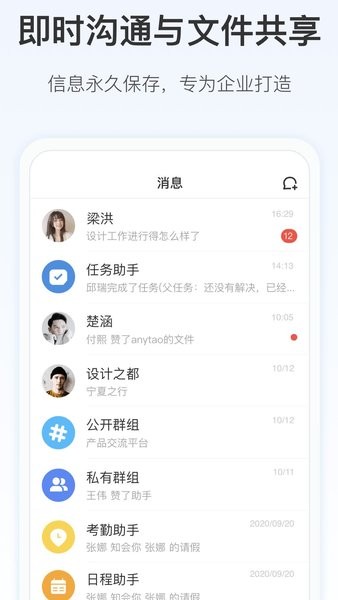 告别微信+邮件的混乱工作方式,专为工作场景打造的企业沟通工具,消息历史永久在线保存,随时讨论任务、日程、文件等。