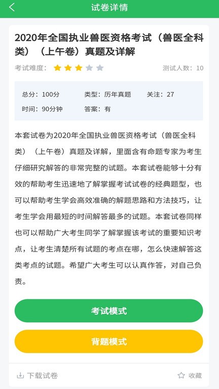 软件有模拟考场、历年真题练习、每日一练、快速练习、考点练习、考试押题、做题记录等多种学习与做题模式、丰富多样化的陪你一起考执业兽医。