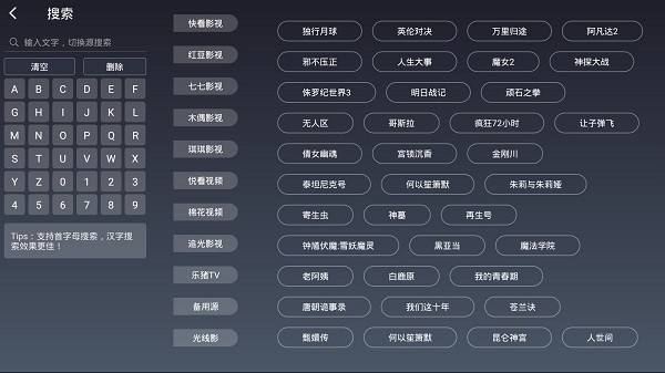 2、点击右上角(TV盒子按菜单键)有更多资源站点选择,换源可以切换首页显示数据,不同首页资源显示的内容也是不一样的。