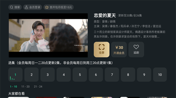 另外,这个软件最大的优点是广告少,不像其他平台那样动不动就插播广告。操作也简单,支持遥控器控制,适合在电视上用。而且更新速度很快,热播剧集基本都能及时上线。