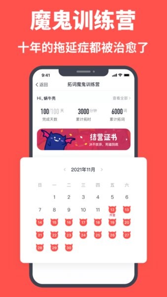 ・「魔鬼训练营」科学方法+专业训练+组队学习+教练监督,100天掌握6000单词,让你的坚持成为习惯。