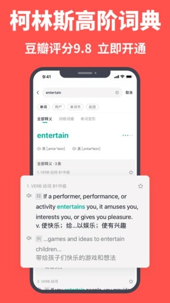 ・拓词全部内容均来自正版《柯林斯高阶学习词典》权威授权,免费开通,学地道英语。