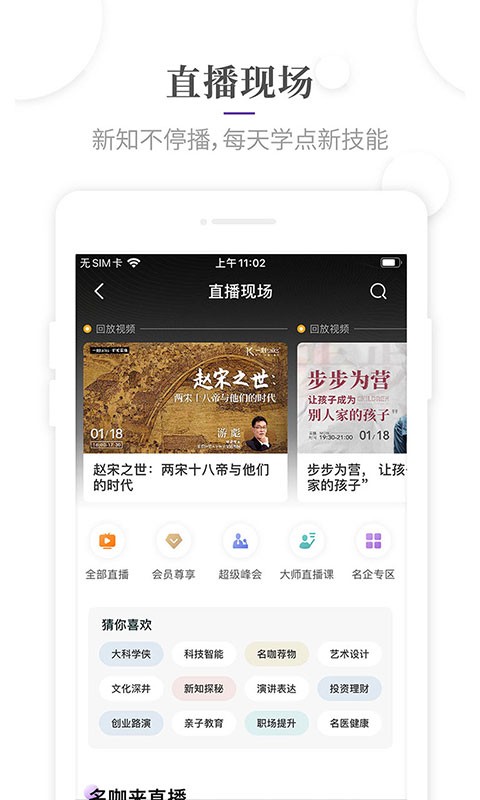 1、直播模块,汇聚了一刻talks热门直播,您可以通过预约直播实时观看