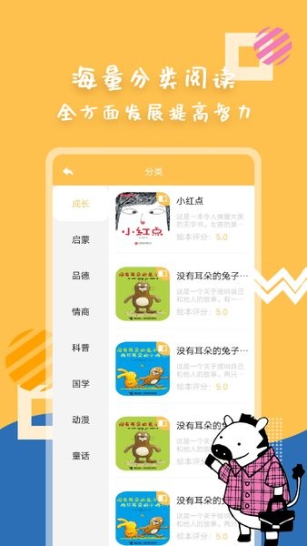 益智早教软件,用户下载app之后就可以在线搜索各种绘本内容,从童话故事到国学科普,丰富的内容可以满足家长的教育需求。趣味的卡通风格能够吸引孩子的注意力,让孩子在玩耍中学习到更多知识。