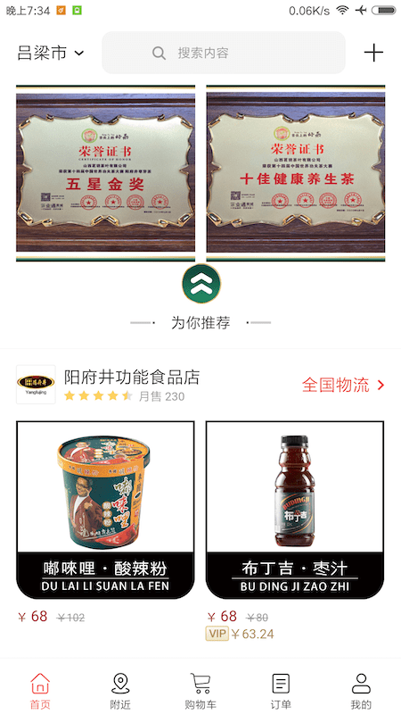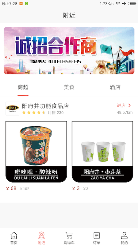 实时定位推荐附近商超、美食、酒店资源,服务就在身边;