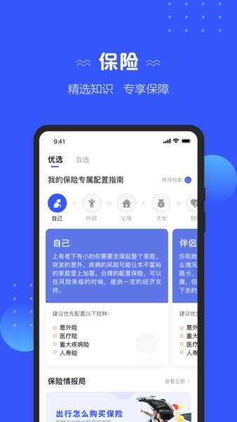 “优选”首页,简单输入几项信息,生成家庭保障方案,了解专业保险知识,获取保险资讯,选购精选保险。