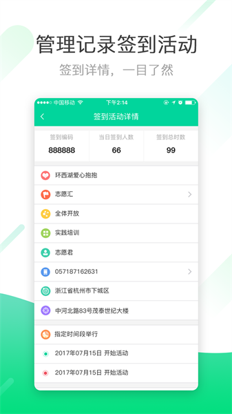 针对创建公益活动,创建签到活动,可针对参与活动志愿者签到、签退进行记录;