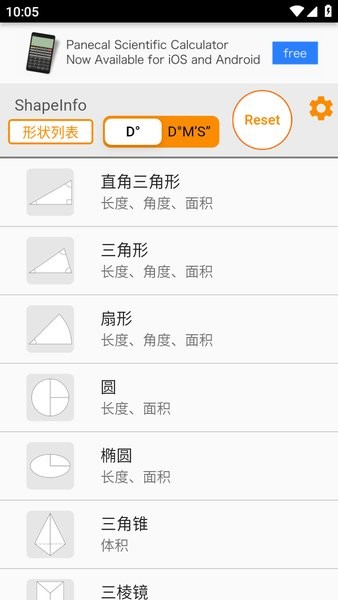 shapeinfo安卓下载app可以用于计算三角形、扇形、圆、椭圆、三角锥、三棱镜、圆柱、球体等多种图形,可以计算面积、体积,三角形可以计算角度;只需要输入相关数据,就可以立马计算出来,使用非常的简单。