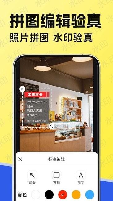 工作水印相机安卓版是一款提供水印相机拍照打卡的应用软件,适用于多种场景,可以随时随地进行拍照,高清拍摄记录,显示时间地点水印,还提供海量模板选择,一键使用,证明工作历史,照片拼图编辑,水印验真,方便又简单!