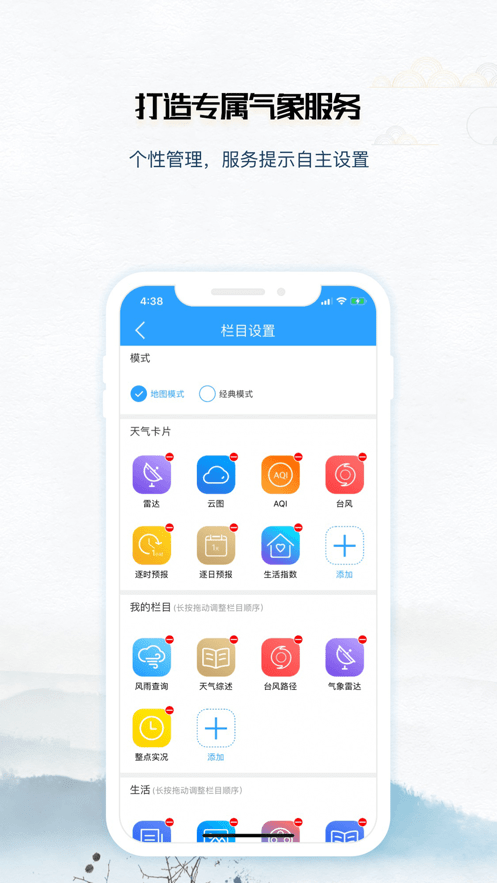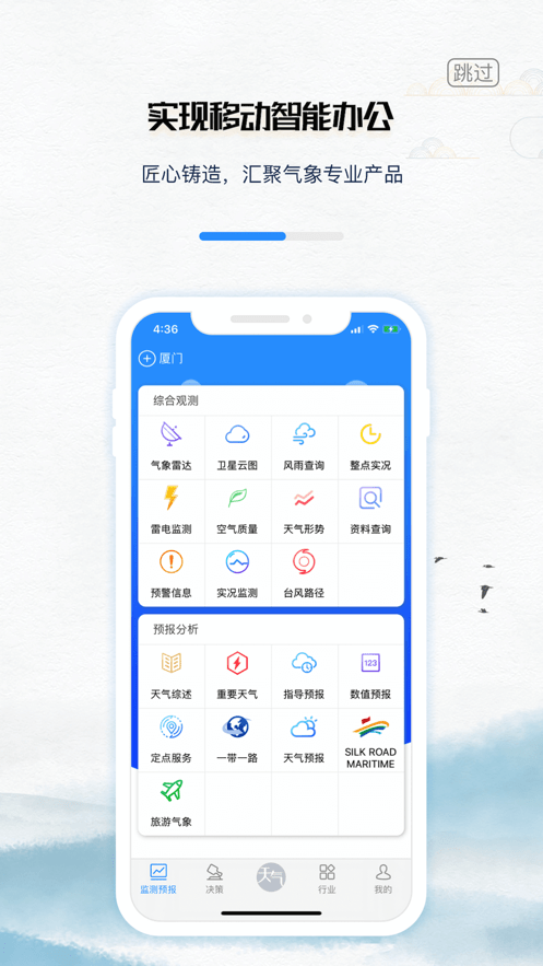 气象产品更丰富更领先,气象雷达、卫星云图、台风路径、数值预报、交通气象、天气综述、整点实况趋势图、海洋天气等,气象工作更加移动智能办公;支持个性设置,管理你的气象产品;