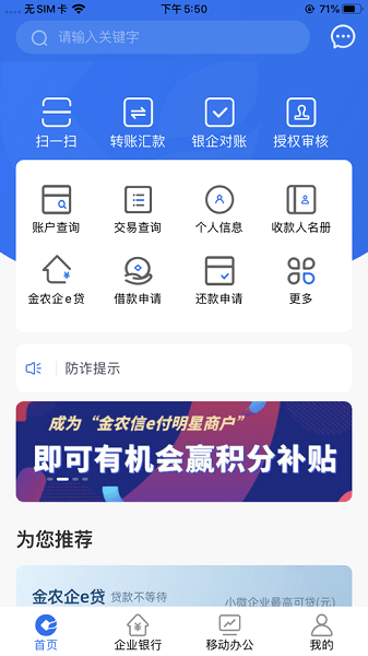 安徽农金电子银行企业版app最新版是面向企业公司的掌上移动银行服务平台,功能丰富实用,方便快捷,集账户查询、交易查询、转账汇款、银企对账、授权审核、借款申请等服务为一体,精选智能推荐,提供最新资讯和活动方便了解,操作十分简单!