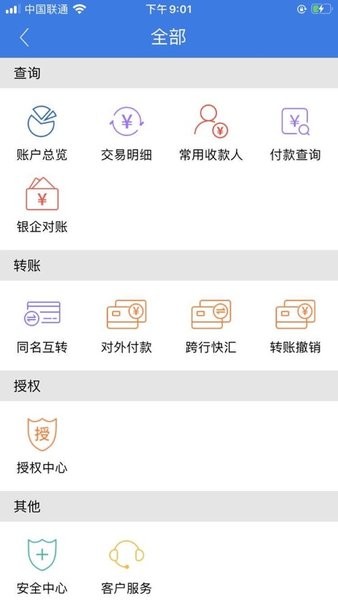 账户总览、交易明细、常用收款人、付款查询、银企对账。