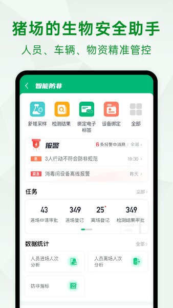 利用互联网能力构建智能防非生物安全体系,软硬件一体化切断非瘟传播途径,实现全面有效防控非洲猪瘟。主要功能模块包括:空间防非、人员防非、车辆防非、物资防非、猪只防非、采样检测等。