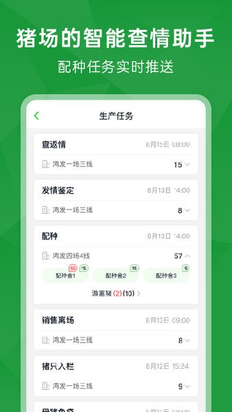 人、猪、物、场、企实时在线精准化管理,生产指标、业务数据实时采集汇总分析,异常主动推送,自动决策分析
