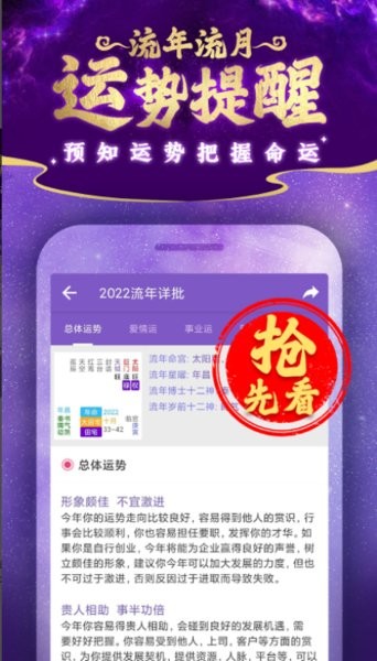 1、查找方便、简单易懂!只要输入自己的出生年、月、时辰,就能快速得知个人的流年流月,每日运势!
