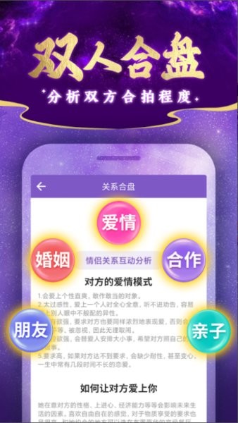 紫微斗数排盘手机版是一款提供算命排盘服务的应用工具,支持运势预告运势提醒、双人合盘、姻缘报告等服务,可以预知运势把握命运,分析双方合拍程度,预测爱情走向,凶吉提前知晓,准确率高,测试方便简单,有需要伙伴可以前来体验!