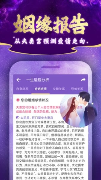 3、先天分析,从您的紫微排盘中查看您的运势报告、事业报告、感情报告、健康报告和财富报告等详细分析报告。