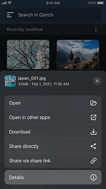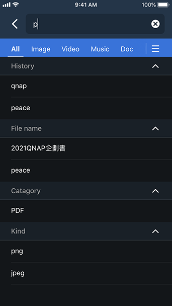 通过脱机搜寻功能同时查找其他 QNAP APP (包含 Qfile、Qphoto、Qmusic 和 Qvideo) 的脱机文件。 注意:此功能仅 Android 版本支持。