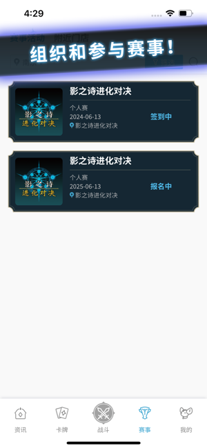本APP将从对战、资讯、卡查、赛事等方面为“影之诗:进化对决”提供更加有趣、便利的支持!