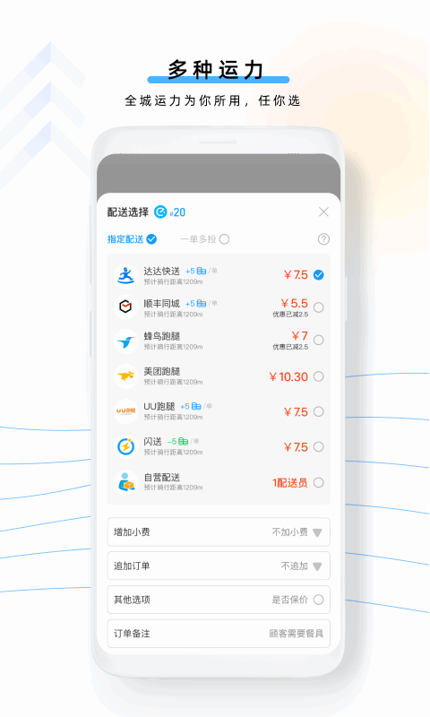 一键发单、自动发单、手动发单、OCR识别、智能黏贴, 多平台比价、同时抢单、同步操作 ,接单状态、骑手位置实时同步