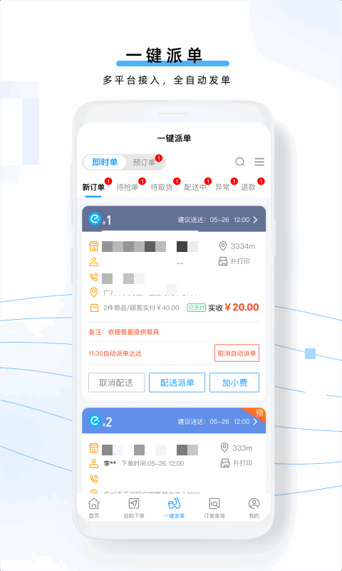 -- 自动派单:商户对接平台,选择多平台按照设定的时间进行自动派发配送呼叫配送小哥取货,配置好发单偏好,所有符合要求的订单自动发起配送