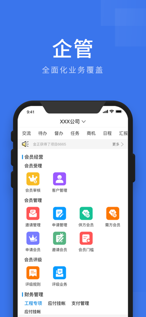 企管帮最新版是一款提供企业管理办公的应用app,带来全面化业务,包括待办、督办、任务、商机、日程、汇报等,还有会员管理、财务管理功能服务,提供通讯录可以随时交流,信息化协作通讯,多人协同合作,有效提高办公效率!