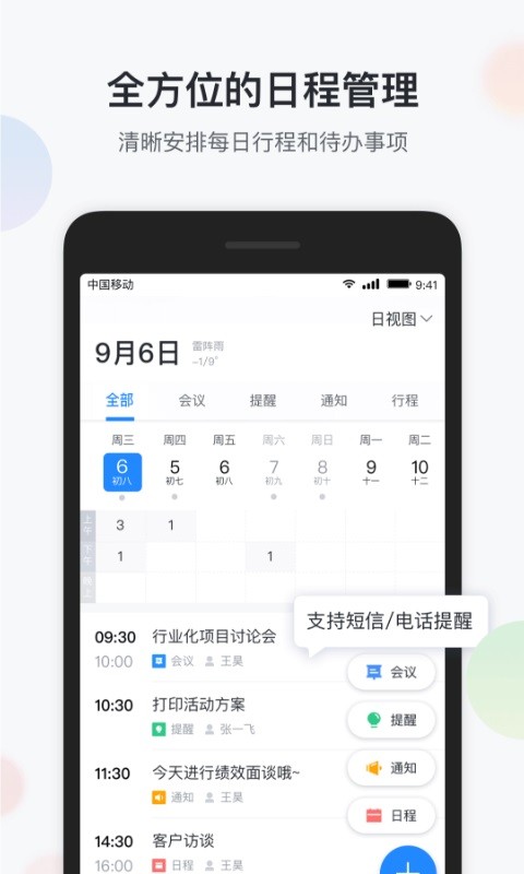 【日程同步】支持会议邀请、个人提醒、团队通知和事项通知,重要待办多重提醒不遗漏。