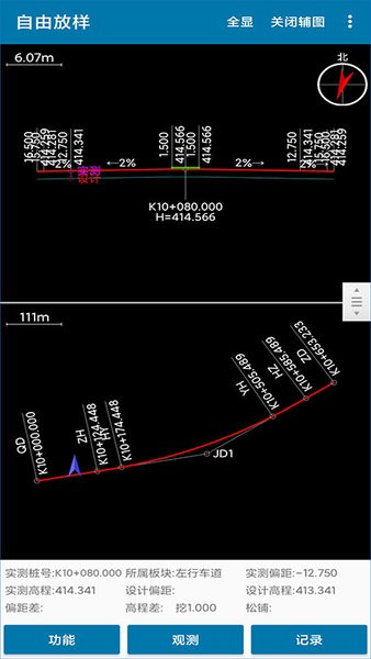 2、横断面采集。增加平面与断面图的同时显示,平面图显示当前位置及桩号法线方向和前后已测量的点位,便于跑尺和补测,断面图显示已测量点及设计线,包括挡墙,便于确定测量范围。