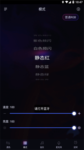 APP提供几十种动态模式供用户选择,有单色动态、混色动态、渐变、跳变、呼吸变化等多种模式。在此模式下,用户可通过APP调节灯光亮度和速度的快慢