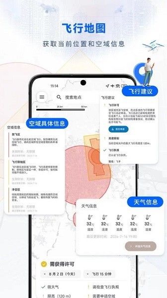 全国空域信息实时更新,适飞空域、机场和禁飞区一目了然,助您轻松规避风险,飞行安全又合法。