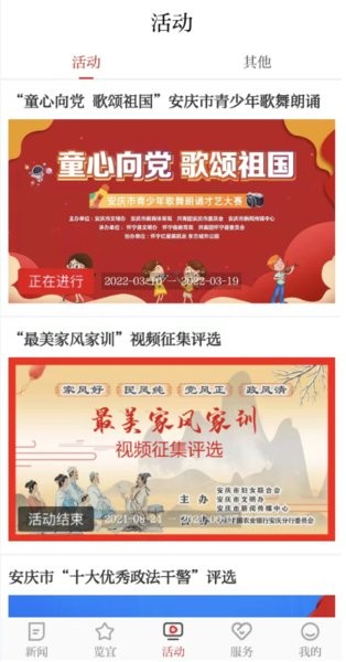 “掌上安庆”客户端以“新闻+政务+服务”为核心,设有“新闻、活动、直播、服务、我的”五大功能版块,综合运用文字、图片、视频、H5等多媒体手段,打造全新融媒体产品。同时设置“推荐、安庆号、本地、读报、时政、生活、专题、看天下”等频道,为用户提供快速全面的本地资讯服务和广泛的政务、民生服务。