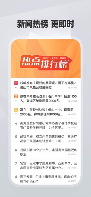 1、每天新的新闻资讯内容不断更新,聚集全佛新闻资讯,精选热门推荐,多元阅读,高清视频、直播,亲临佛山现场.
