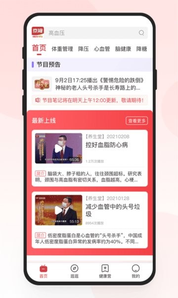 京视健康手机版是北京电视台打造健康养生软件,让许多用户都可以在软件之中关注更多的健康内容,北京卫视的许多健康养成节目的节目预告都可以在这里进行关注。