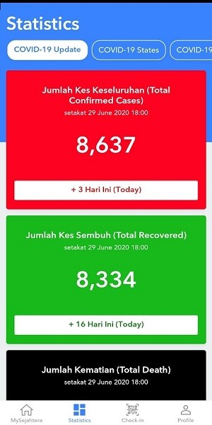 只需点击Statistics,即可查阅大马每日疫情确诊人数。此外,你也可以点击上方的「Covid-19State」和「Covid-19 global」,来了解各个洲属和世界各地统计的确诊人数。