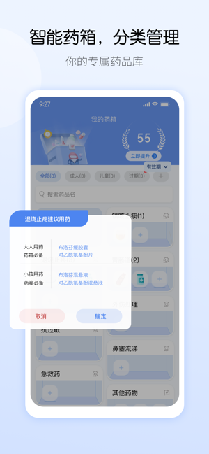 - 分类管理:提供家庭药品必备清单、分类管理,以便快速地找到所需药品;支持添加不同药箱,生成专属药箱和共享药箱。