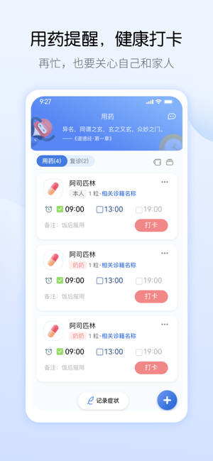 提醒自己和家人按时用药,建立电子病历,记录病情、用药信息、上传身体检查报告、管理药箱等等。