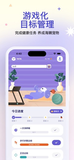 -- 在 OtterLife 中,由一只可爱的海獭作为你的健康伙伴。我们将健康目标设定为游戏化任务。完成任务不仅提升你的健康水平,还能够养成大家的宠物海獭,提升它的等级。